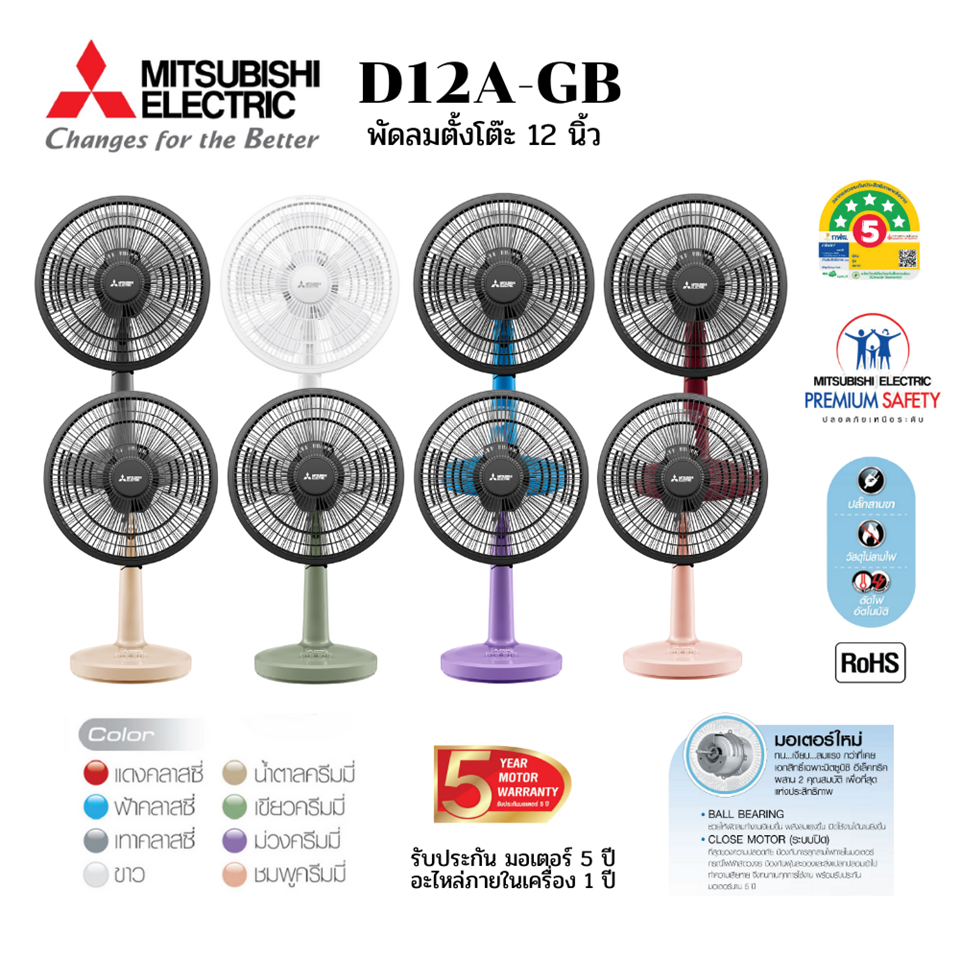 พัดลมตั้งโต๊ะ 12 นิ้ว MITSUBISHI D12A-GB CY-GY สีเทา เย็นสบาย คลายร้อน ด้วยพัดลมตั้งโต๊ะ จาก MITSUBISHI ขนาด 12 นิ้ว สามารถปรับแรงลมได้ 3 ระดับ กระจายแรงลมได้อย่างทั่วถึง มีดีไซน์ที่เรียบง่ายสีสันสวยงาม มาพร้อมมอเตอร์แบบปิดช่วยป้องกันสิ่งแปลกปลอมเข้าไปภายใน มีประสิทธิภาพสูง ทนทาน และประหยัดพลังงาน ตัวฐานมั่นคงทำมาจากวัสดุคุณภาพดี มีความแข็งแรง ด้วยการใช้วัสดุและชิ้นส่วนที่ไม่ลุกลามไฟ สะดวกต่อการใช้งาน เพิ่มความปลอดภัยด้วยระบบเทอร์โมฟิวส์ และเคอร์เร็นท์ฟิวส์ ที่ตัดไฟแบบอัตโนมัติเมื่อเกิดกระแสไฟฟ้าเกิน หรือไฟฟ้าลัดวงจร ตอบโจทย์การใช้งานได้อย่างลงตัว พร้อมให้ความเย็นกับคุณได้ตลอดเวลา คุณสมบัติ มอเตอร์มีประสิทธิภาพสูง ทนทาน ประหยัดพลังงาน พร้อมมอเตอร์แบบปิดป้องกันสิ่งแปลกปลอมเข้าไปภายใน ระบบเทอร์มอลฟิวส์ ตัดการทำงานเมื่ออุณหภูมิมอเตอร์สูงเกิน 140 องศาเซลเซียส เพื่อป้องกันมอเตอร์ไหม้ มีระบบเคอร์เร็นท์ฟิวส์ตัดไฟอัตโนมัติ เมื่อเกิดกระแสไฟฟ้าเกิน หรือไฟฟ้าลัดวงจร Premium Safety ปลอดภัยเหนือระดับด้วยการใช้วัสดุ หรือชิ้นส่วนที่ไม่ลุกลามไฟ มาพร้อมกล่องเหล็กครอบคาปาซิเตอร์ และกล่องเหล็กครอบสวิตช์เพื่อป้องกันการลุกลามไฟ รับประกันมอเตอร์ 5 ปี (ตามเงื่อนไขที่กำหนด) วิธีใช้งาน กดปุ่มเบอร์ 1,2,3 ตามระดับความแรงลม และปุ่มเบอร์ 0 เพื่อปิดเมื่อเลิกใช้งาน คำแนะนำ ศึกษาวิธีใช้ คำเตือน และคู่มือติดตั้งก่อนการใช้งานให้ถี่ถ้วน ข้อควรระวัง ห้ามใช้พัดลมโดยที่ประกอบชิ้นส่วนไม่ครบ หรือชำรุด ห้ามดัดแปลง หรือใช้ร่วมกับอุปกรณ์ที่ไม่ได้มาตรฐาน ห้ามเปิดใช้งานนานจนเกินไป อาจทำให้มอเตอร์ไหม้ได้ ห้ามให้เด็กเล็กเข้าใกล้ หรือใช้นิ้วแหย่ ไม่ควรวางไว้ใกล้ที่ ๆ มีอุณหภูมิสูง หรือเปลวไฟ