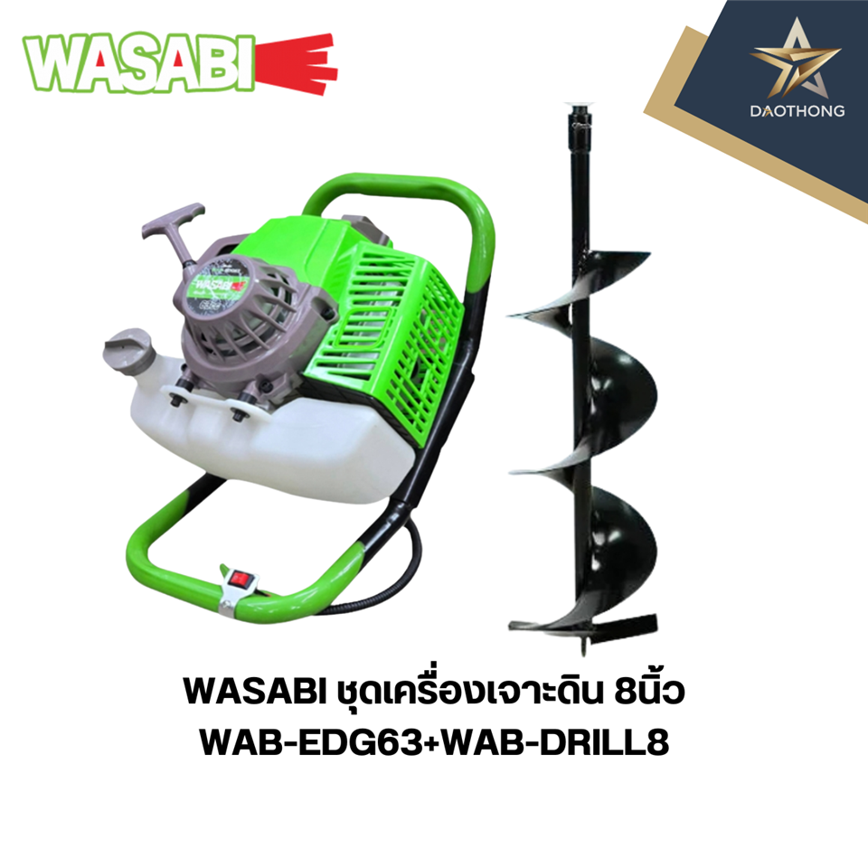 เครื่องเจาะดิน รุ่น WAB-EDG63+WAB-DRILL8 กำลังเครื่องยนต์ : 4 แรงม้า เครื่องยนต์ : เบนซิน 2 จังหวะ รอบเครื่องยนต์ : 7000 รอบ/นาที กระบอกสูบ : 63 cc. คาร์บูเรเตอร์ : ไดอะแฟรม น้ำมันเชื้อเพลิง : เบนซิน/แก๊สโซฮอล์ 91,95 ความจุถังน้ำมัน : 1 ลิตร ระบบสตาร์ท